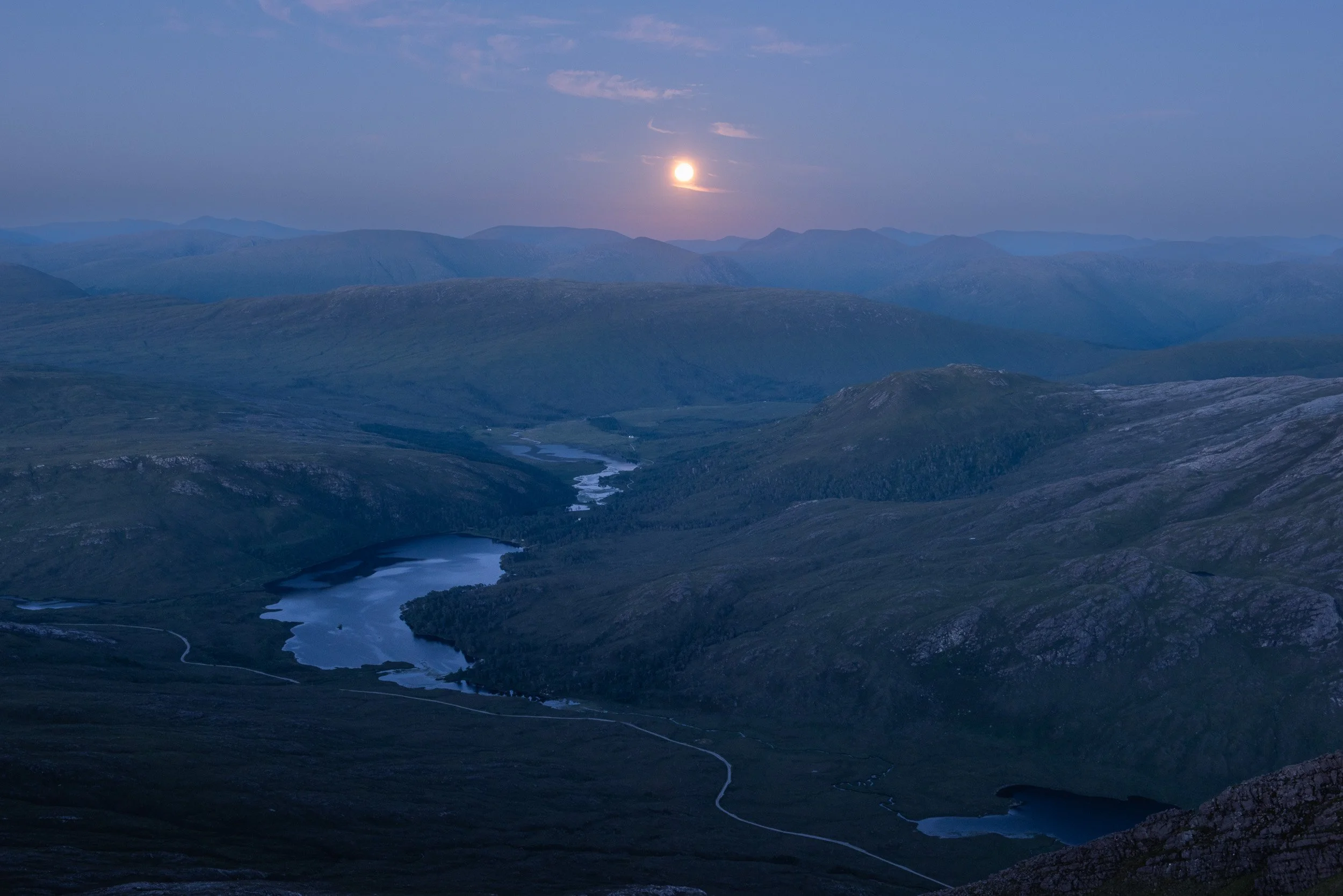 The moon rises above Loch Clair in Glen Torridon, Scotland, as seen from the summit of Spidean Coire nan Clach